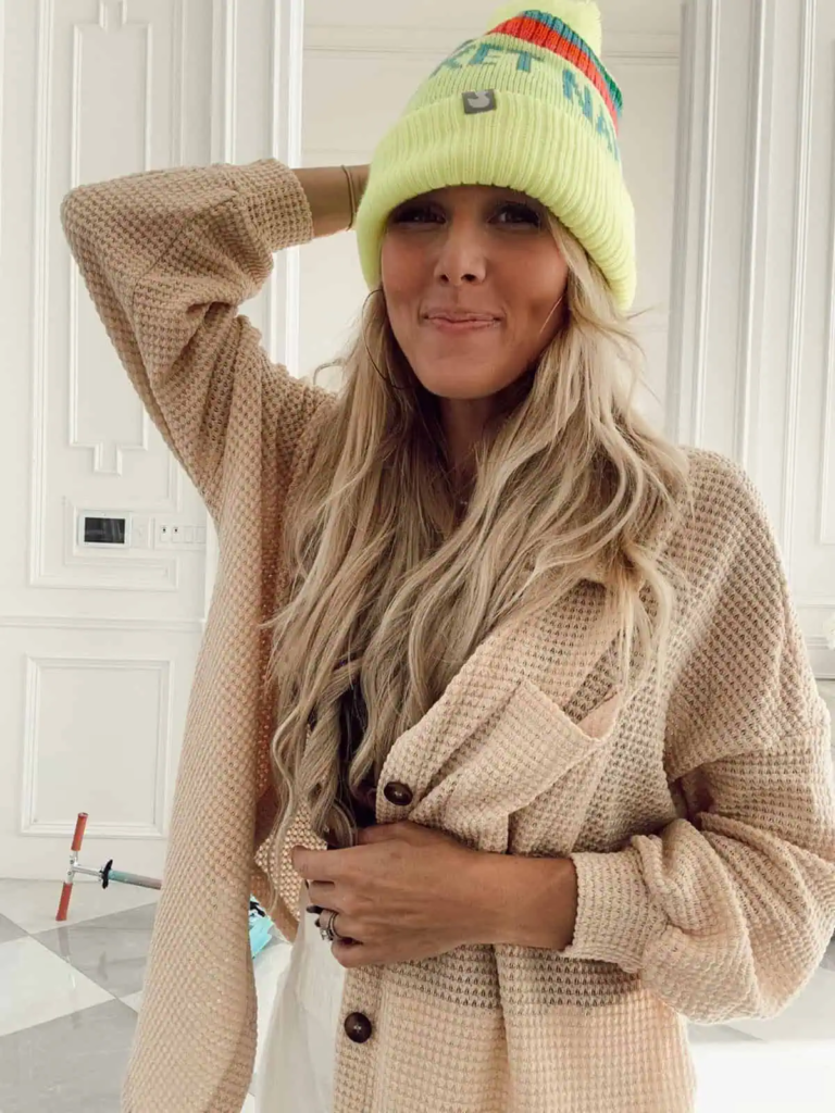 A loose beige cardigan creates a comfortable base that’s perfect for layering during cooler weather. The bright beanie adds an unexpected pop of color that makes the outfit feel playful. Together, the pieces balance warmth with personality.