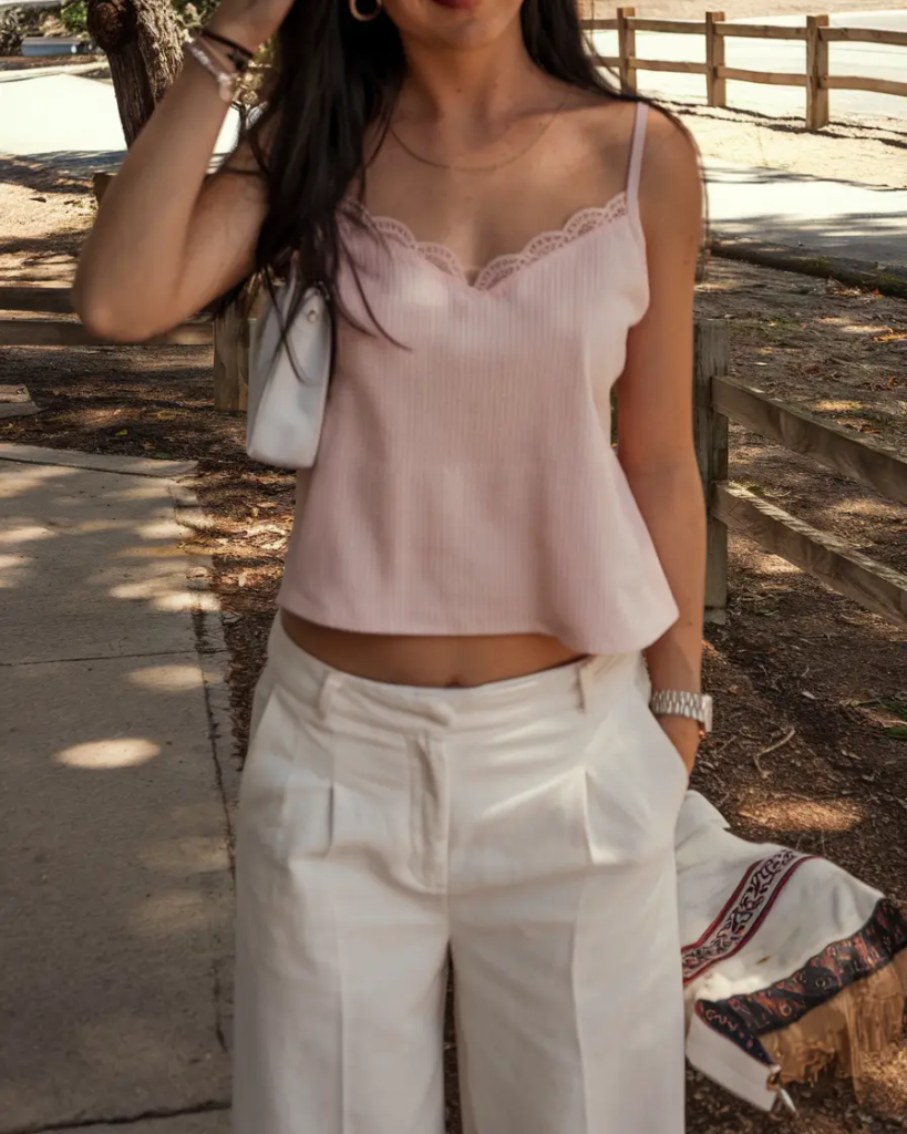 This outfit combines a soft pink camisole with cream tailored trousers, creating a balance between delicate and structured pieces. The mix of light knit fabric on top and crisp pleats below keeps the look polished while still comfortable for warm weather. It feels feminine but also confident and practical for everyday summer plans.