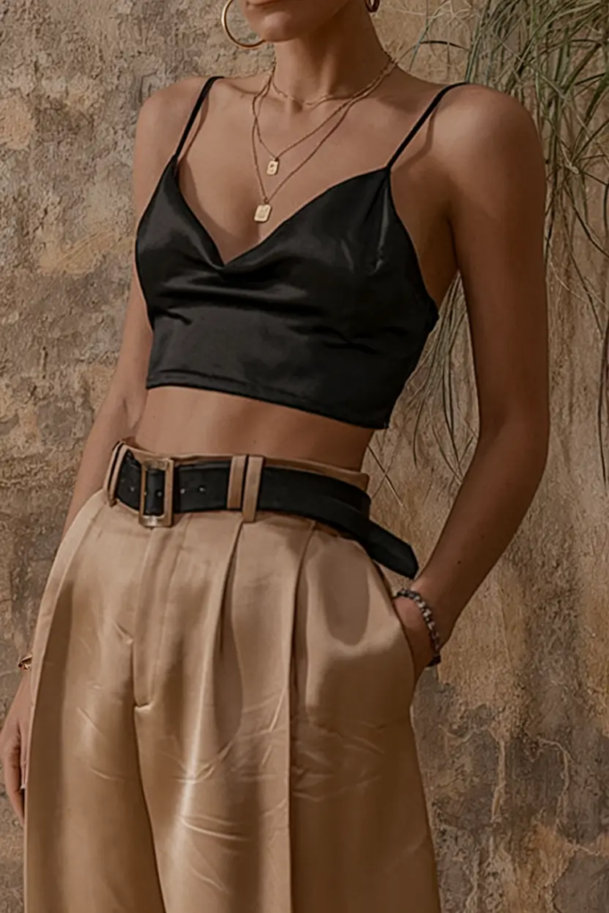 A black satin top combined with caramel wide-leg pants creates a stylish contrast between shine and softness. The draped neckline adds elegance while the structured trousers keep the outfit balanced. This look works well for evening outings in warm weather.