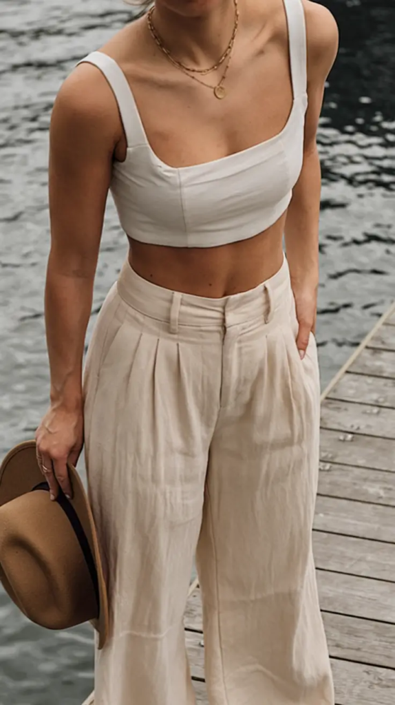 A linen crop top with wide ivory trousers creates a light and breathable outfit perfect for summer trips. The structured neckline and soft pleats give the outfit shape while still feeling comfortable. It suits relaxed weekends and warm outdoor settings.