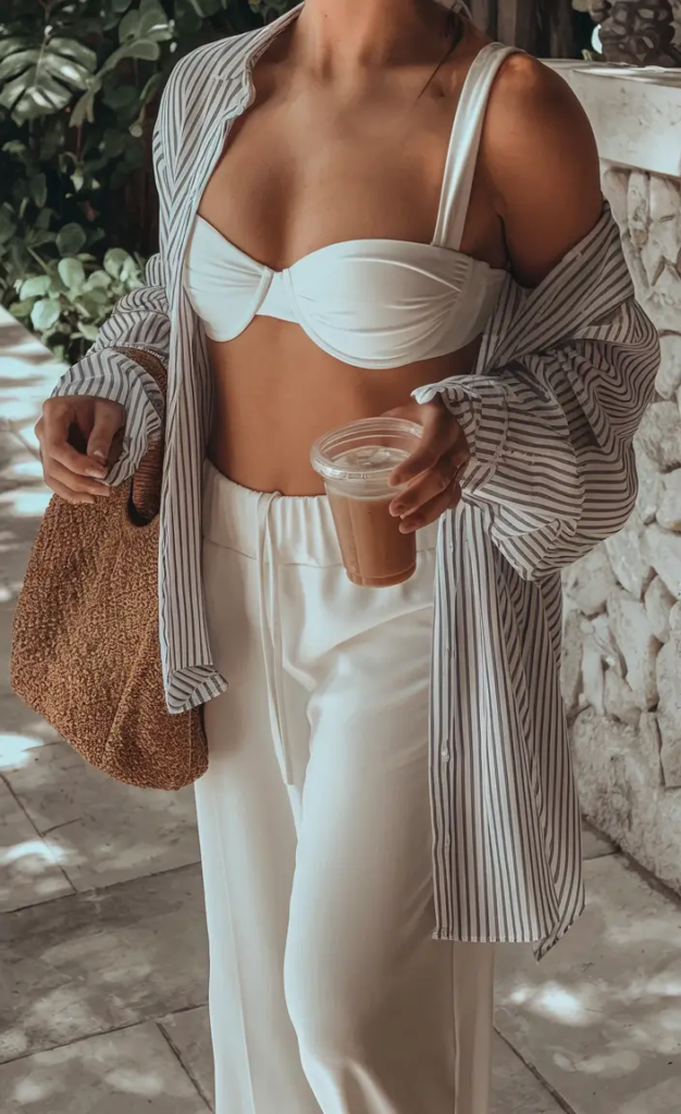 A bikini-style top layered under a striped shirt with wide trousers brings beachwear into everyday fashion. The open shirt keeps the look balanced while the trousers add comfort. It feels fresh and modern for summer outings.