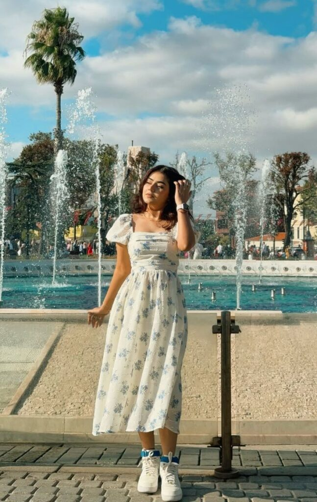 A blue and white floral midi dress is a versatile choice among summer birthday outfit ideas because it blends elegance with comfort. The sleeveless design keeps the outfit light for warm weather while the sweetheart neckline adds soft feminine detail. Its midi length works well for both daytime events and casual dinner celebrations. Keeping accessories minimal allows the floral pattern to remain the highlight of the outfit.