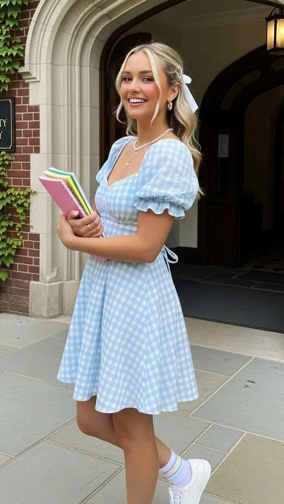 A sky-blue and white gingham dress with puffed sleeves creates a playful and cheerful feel for summer birthday outfit ideas. The fit-and-flare shape offers comfort while still giving the outfit a flattering structure. A sweetheart neckline adds a hint of polish that works well for casual celebrations. Styling the dress with white sneakers and layered gold jewelry keeps the look approachable and perfect for brunch parties or daytime gatherings.