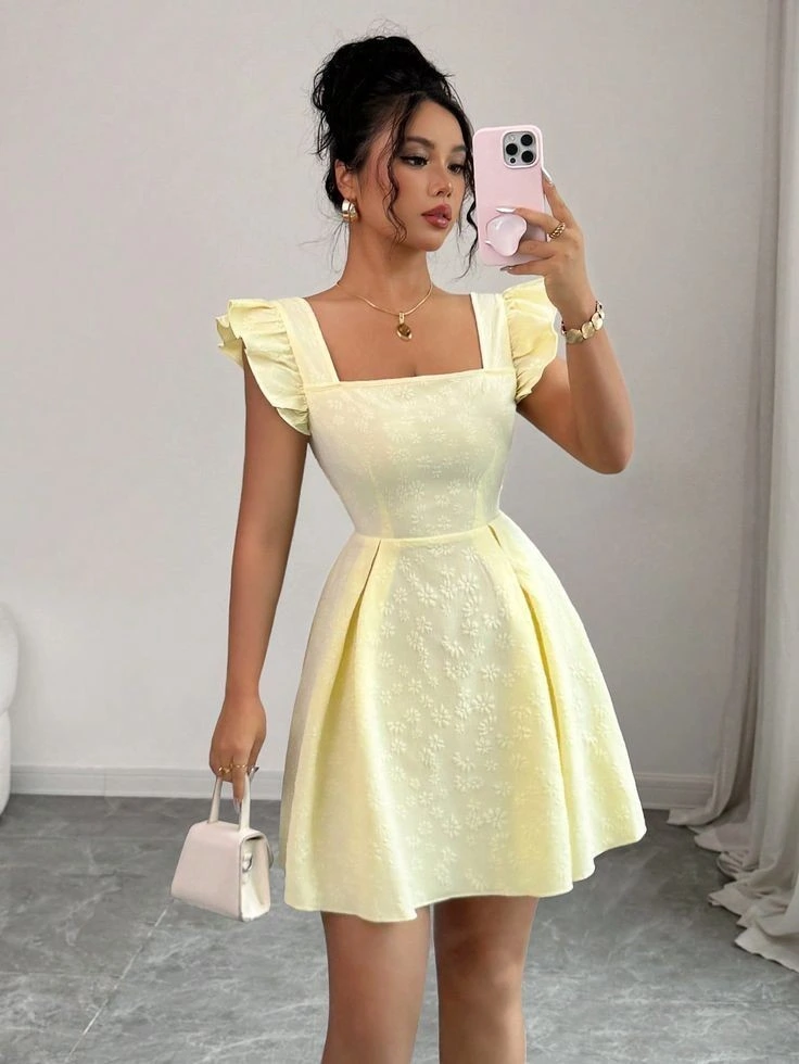 A buttercream-yellow dress with embroidered details and soft ruffled sleeves captures a cheerful party mood within summer birthday outfit ideas. The fitted bodice and flowing skirt create a balanced silhouette that feels both playful and polished. A modern square neckline adds structure while the midi length keeps the outfit appropriate for many different birthday settings. A crisp white bag and delicate gold jewelry finish the look with simple elegance.
