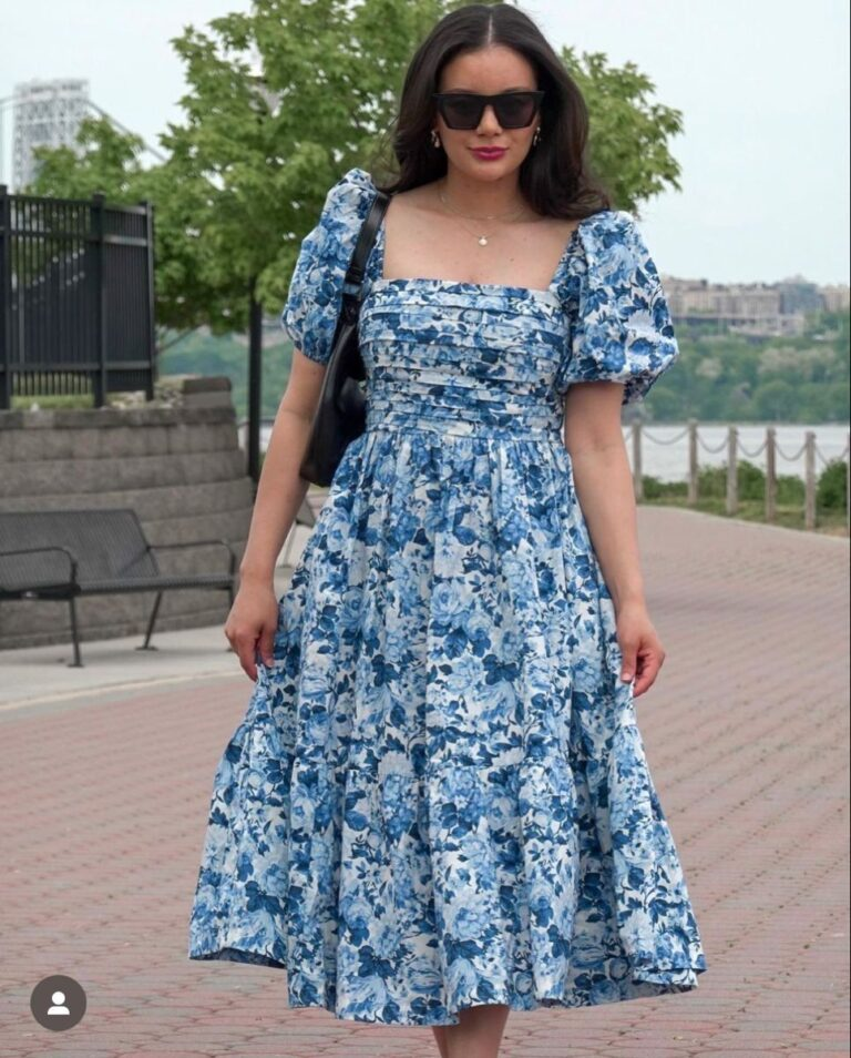 A blue and white floral midi dress with puffed sleeves brings a classic romantic feel to summer birthday outfit ideas. The ruched sweetheart neckline adds structure while still keeping the outfit soft and feminine. Its midi length makes it suitable for both daytime gatherings and evening birthday dinners without looking overly formal. Simple accessories like black sunglasses and a small pendant necklace keep the outfit balanced and easy to wear for different occasions.