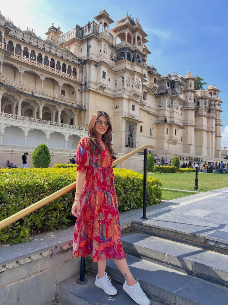 A bold botanical print midi dress instantly adds color and personality to summer birthday outfit ideas while still feeling effortless. Pairing it with clean white sneakers makes the outfit practical for walking while keeping the look polished. Simple gold jewelry and classic aviator sunglasses add a touch of elegance without making the outfit feel too formal. This combination works well for birthday celebrations that involve exploring a new place, taking photos, or spending time outdoors.