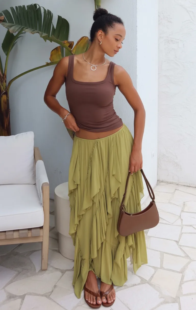 3. Earthy Tank with Flowing Olive Skirt