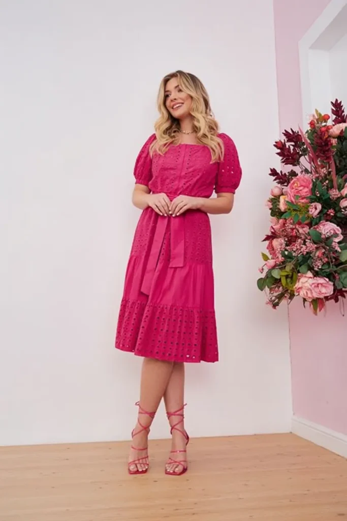 10. Bright Pink Eyelet Midi with Feminine Polish