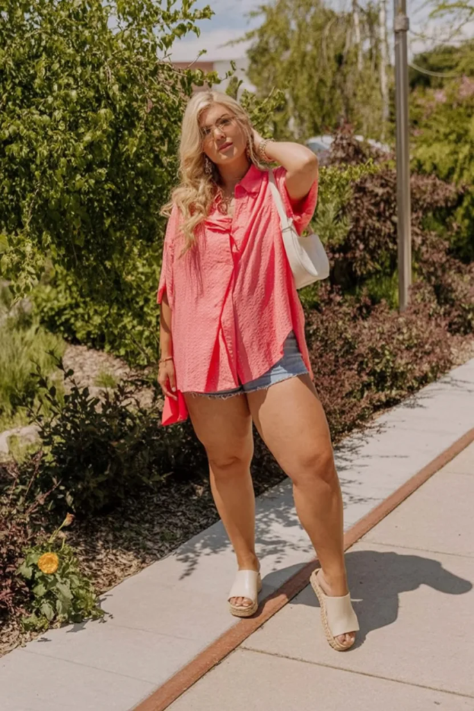 15. Coral Oversized Shirt and Denim Shorts