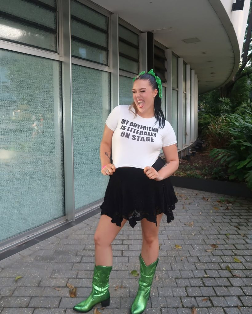 Bold graphic tees with playful mini skirts make me feel energetic at pop concerts. Green ribbon hair accessories or metallic boots can enhance the look, keeping it fun but practical for dancing.