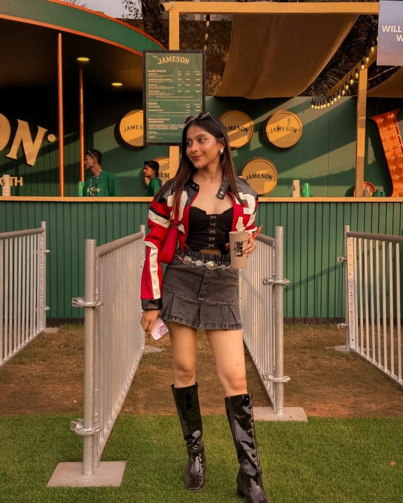 A white lace mini dress with cowboy boots feels romantic and effortless. It’s perfect for sunset shows or daytime festivals, and adding a denim jacket gives extra versatility without losing the feminine vibe.
