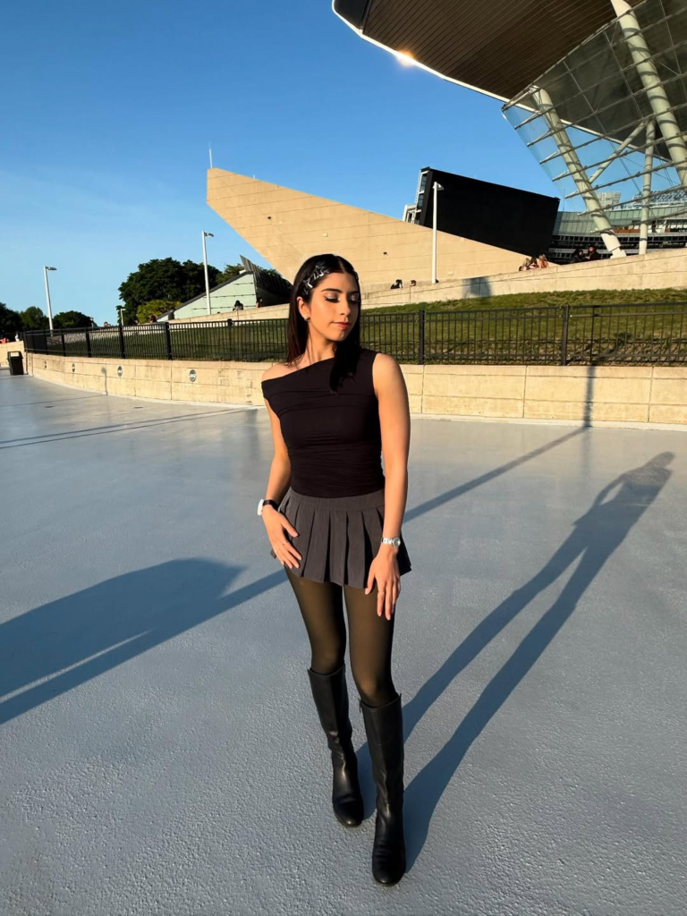 One-shoulder tops with pleated mini skirts give a polished night-concert look. Knee-high boots and sheer tights add confidence and subtle elegance without overcomplicating the outfit.