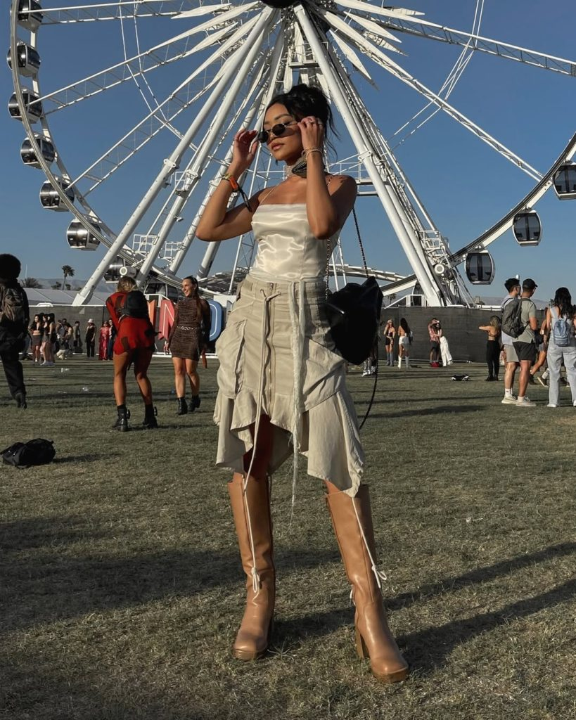 Satin tops with flowing skirts give a striking festival look. Tall boots ground the outfit, and sunglasses add a modern touch. This is perfect for daytime shows where style meets practicality.