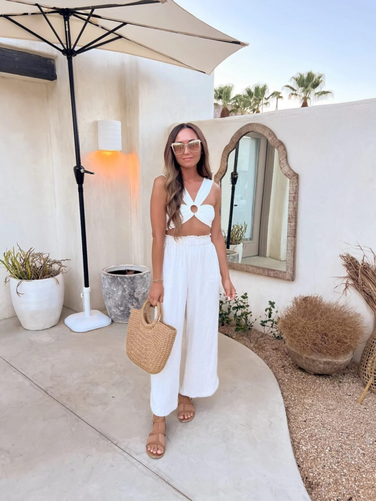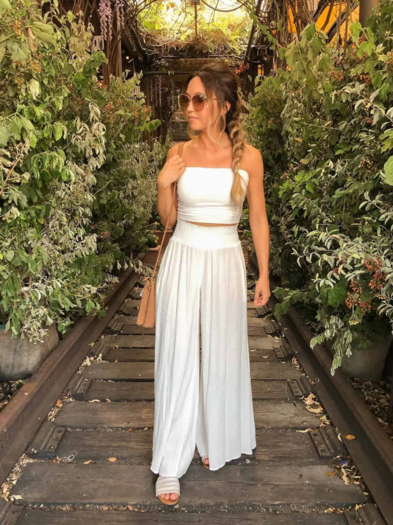 All-white outfits are my go-to for beach settings. They reflect heat and look fresh in sunlight.