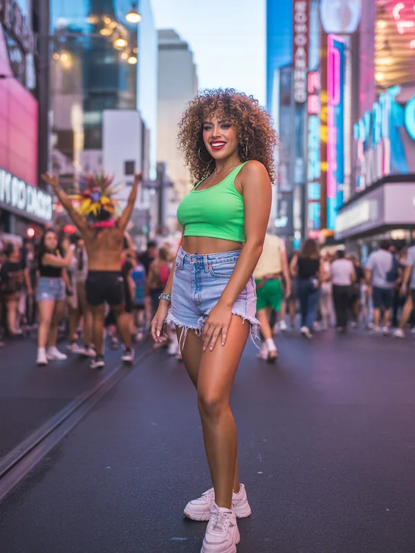 A neon crop top combined with distressed shorts creates a bold and energetic outfit that fits the fun Vegas vibe. Chunky sneakers make the look comfortable enough for walking and exploring throughout the day.