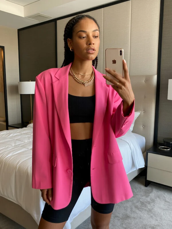 Hot Pink Oversized Blazer With Bike Shorts And Crop Top