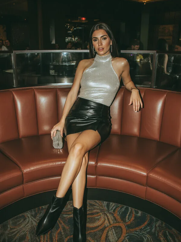 A sparkling halter top paired with a leather mini skirt creates a dramatic evening look. Ankle boots add a cool edge while keeping the outfit balanced between glamorous and bold.