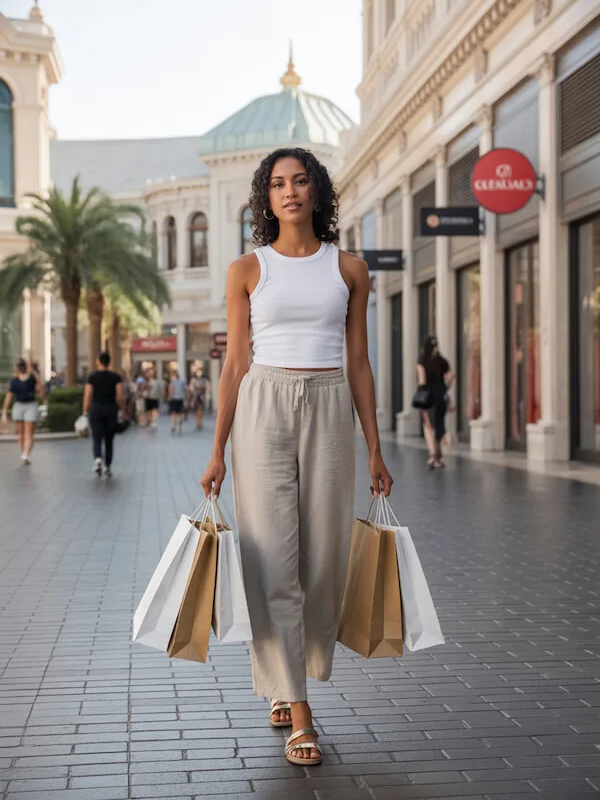 A basic white tank with linen pants forms a light and comfortable outfit ideal for hot weather. Flat sandals keep the look practical while still feeling relaxed and polished.