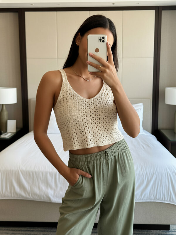 The crochet tank adds texture while olive wide-leg pants create a flowing silhouette. Together they form a balanced outfit that feels both stylish and easy to wear.