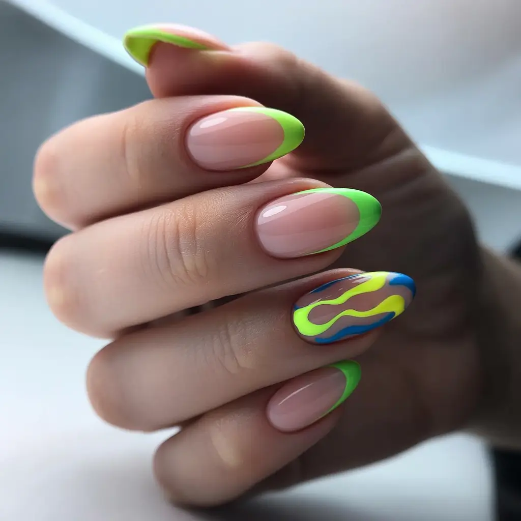 Reverse neon French with deep teal contrast