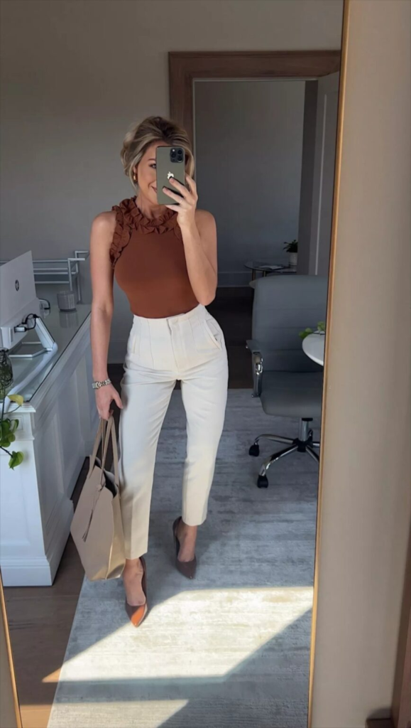 Warm tones like rust paired with cream always feel rich and clean together. I like how this combination looks structured without being too formal. These Summer work outfits are perfect when I want to look sharp but still stay comfortable.
