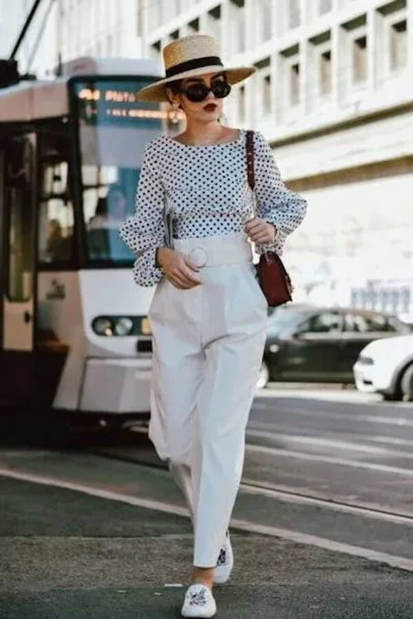 Polka dots bring a classic and slightly playful touch to office wear. I pair them with simple trousers to keep the look clean and balanced. This makes it one of those Summer work outfits that helps me feel confident before an important meeting.