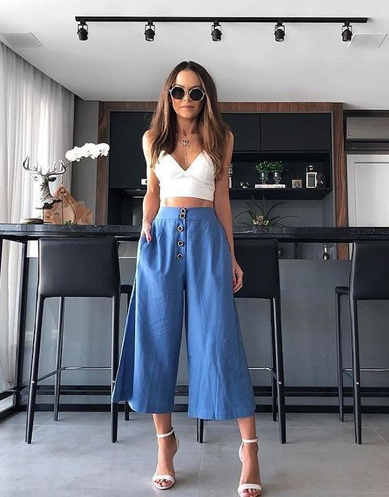I prefer clean basics for beach-inspired outfits. A white tank with patterned pants keeps things light and breathable.