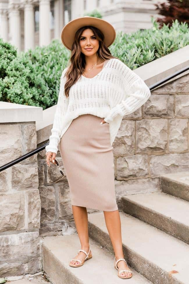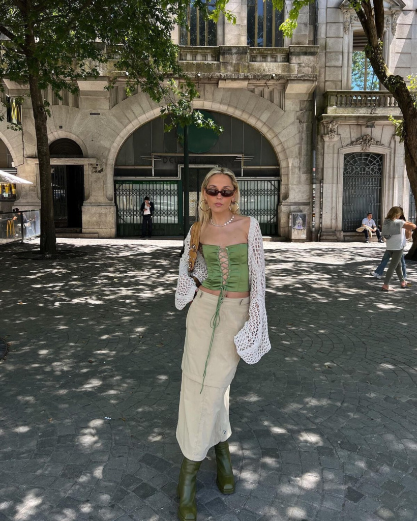 I like mixing soft textures like knitwear with light summer fabrics. A cropped knit top with a midi skirt creates a calm, neutral outfit.