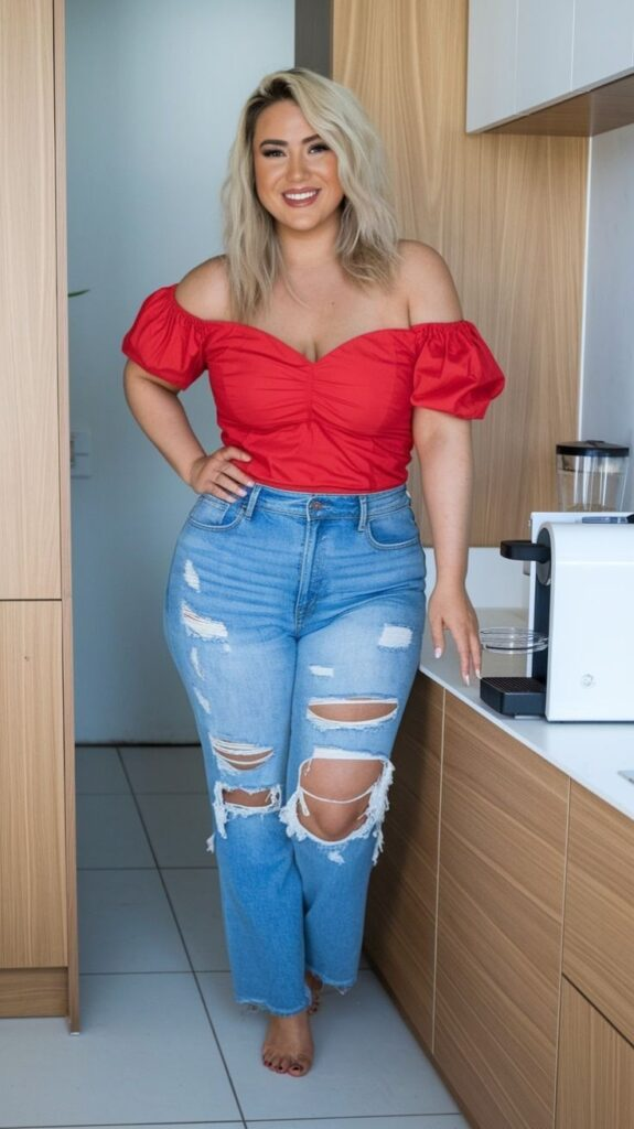 A bold red top instantly becomes the focus of the outfit. I pair it with distressed denim to balance the intensity.