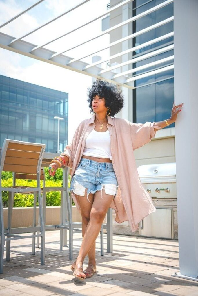 Denim shorts and gold jewelry balance the look. It feels relaxed but still slightly styled for rooftop or outdoor settings.