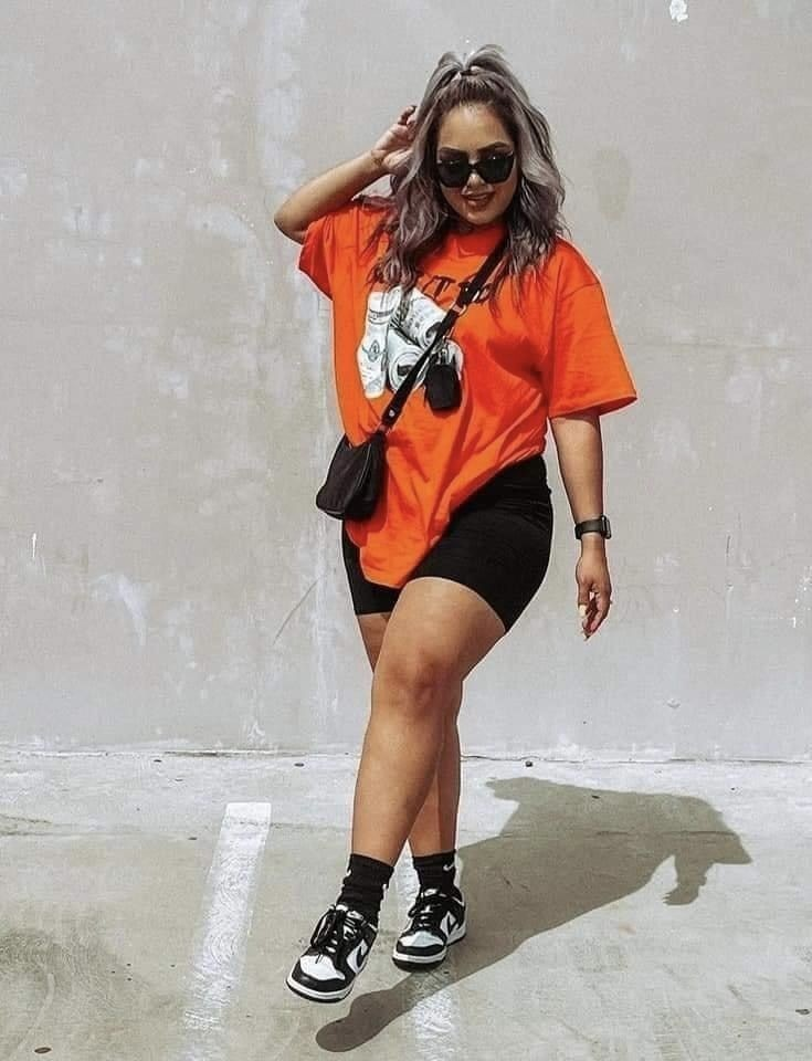 An oversized graphic tee is one of my easiest styling pieces. I pair it with biker shorts to keep the silhouette balanced and comfortable.