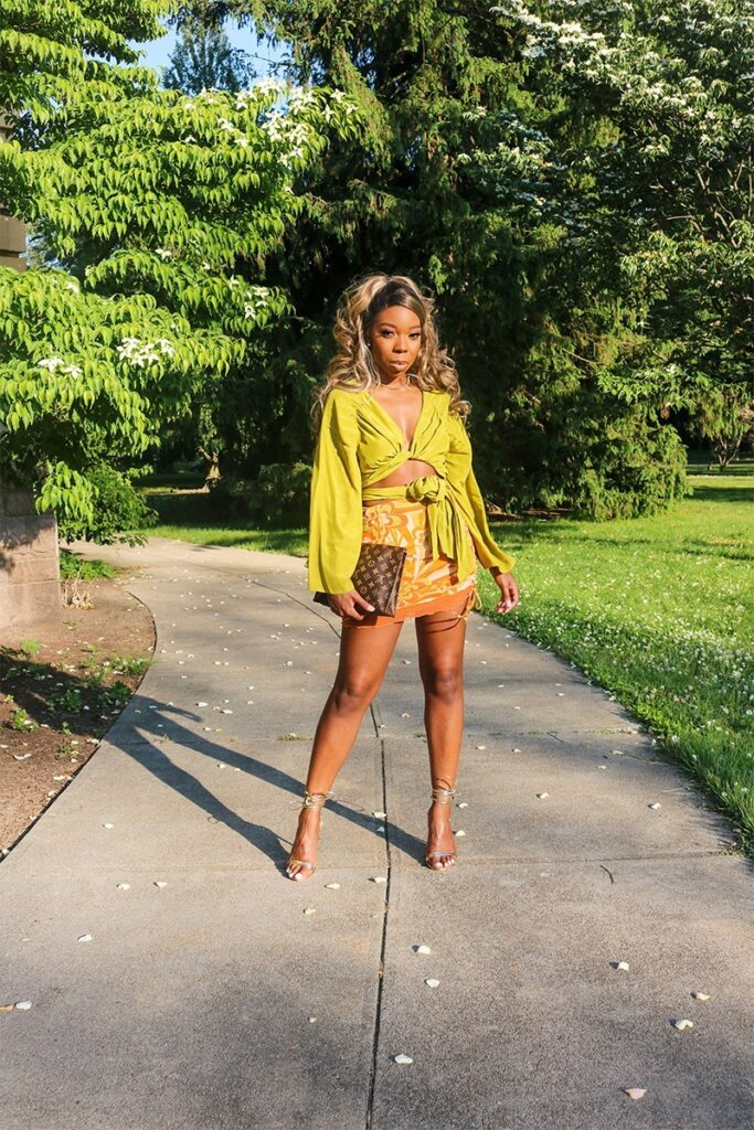 When I want something bold, I go for a wrap top in a strong color like chartreuse. Tying it at the waist helps balance the volume while keeping the outfit flattering.