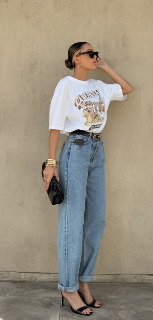 This is one of the easiest outfits to throw together. A graphic tee adds interest, while high-waisted jeans create shape.