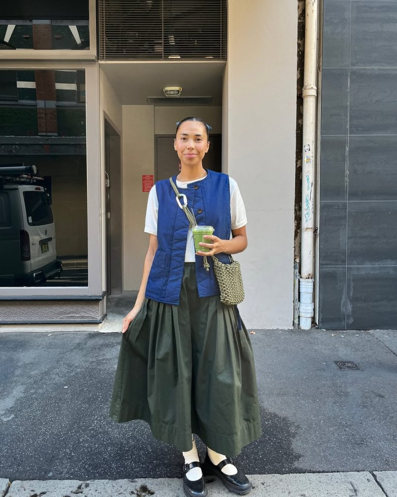 I find this outfit perfect when I want something structured but still comfortable. The vest adds shape, while the skirt keeps it light.