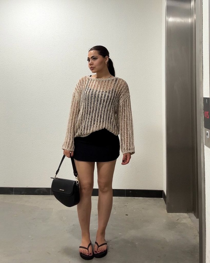 This is something I’d wear in the evening when temperatures drop slightly. The mix of loose and fitted pieces creates a nice balance.
