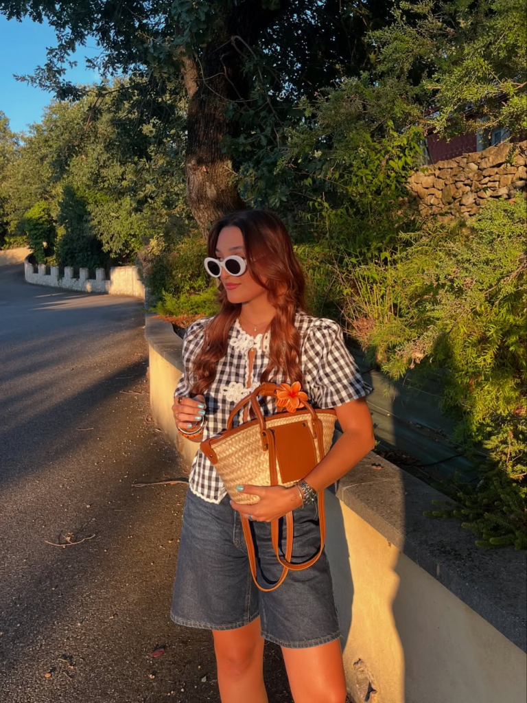 Gingham prints are popular again, especially in summer collections. I avoid formal shoes here to maintain the playful feel.