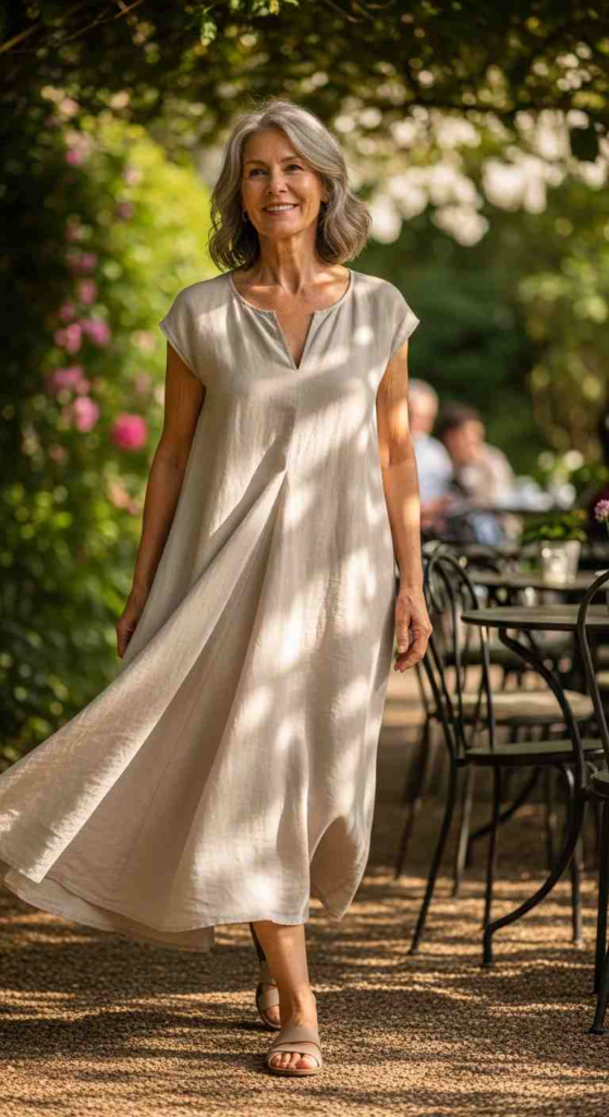 A loose linen dress keeps things simple and cool. It works for daily wear or casual outings.