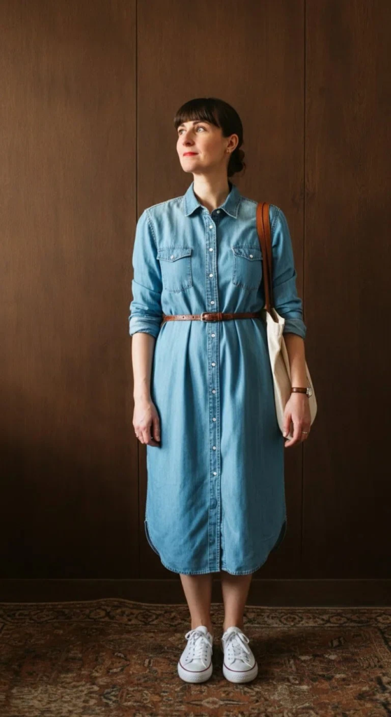 A denim shirt dress is an easy option that looks complete without much styling. A belt at the waist gives it shape while keeping it comfortable. Canvas shoes maintain a casual and practical vibe.