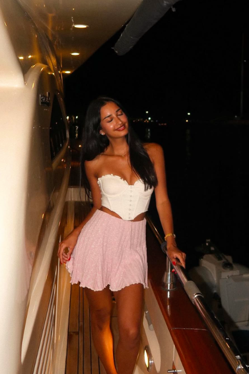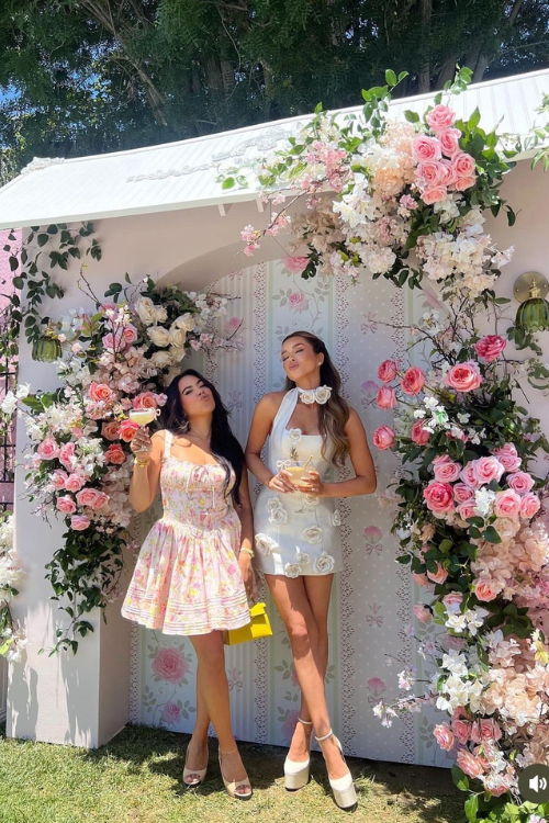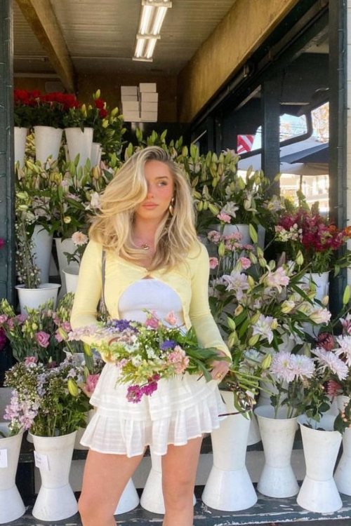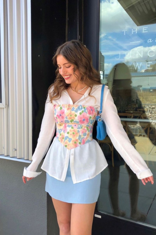 The outfit combines a shirt layered with a floral corset top and a skirt. This pairing creates a playful yet polished style that mixes classic inspiration with a fun and fashionable twist.