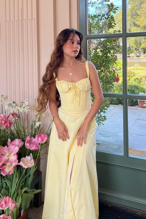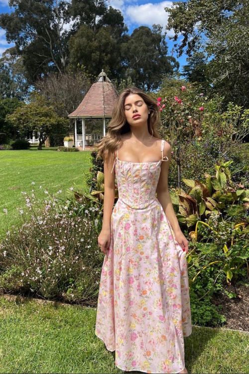 The focus here is on a long, flowing maxi dress that creates movement and elegance. The outfit is ideal for events like outdoor gatherings or garden parties where a soft and romantic style fits well.