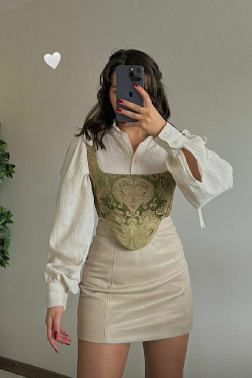 Here the idea is to mix different fashion influences by layering a corset over a shirt and pairing it with a mini skirt. This creates a bold outfit that combines vintage inspiration with a modern and confident look.
