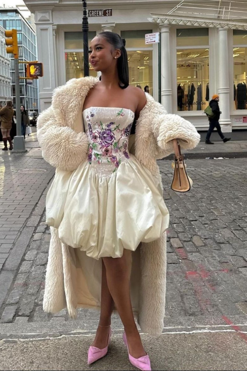 5. fur coat + balloon dress