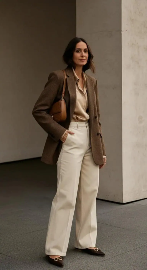 This outfit combines a structured tweed blazer with flowing cream wide-leg pants for a sophisticated yet comfortable classroom look. Pairing it with a silk blouse and pointed flats keeps it polished and practical.
