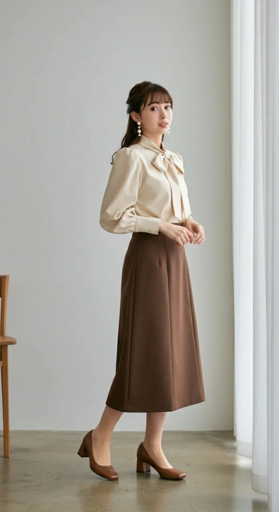 A cream bow blouse with a brown A-line skirt offers a feminine, classic look. Block heel pumps ensure all-day comfort, and pearl drop earrings finish the ensemble with sophistication.