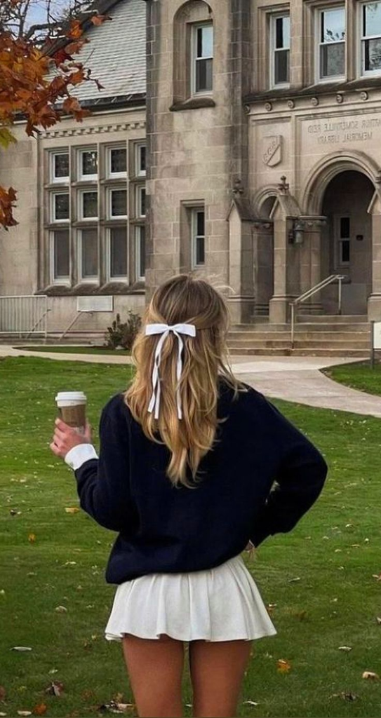 Pairing a navy sweater with a white tennis skirt creates a relaxed, campus-ready look. Adding a ribbon in my hair and holding a coffee cup completes the effortless vibe. This outfit is perfect for daytime errands or coffee meetups.