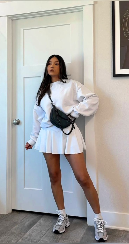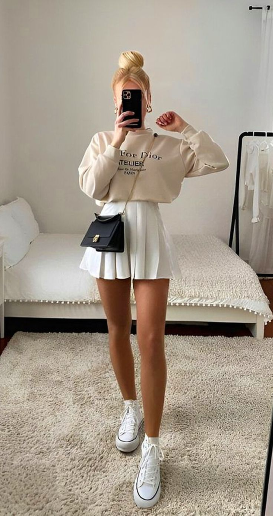 A beige printed sweatshirt with a white tennis skirt feels soft and cozy without looking dull. Pairing it with platform sneakers and a black crossbody bag completes the look. I find this outfit works for relaxed weekend plans.