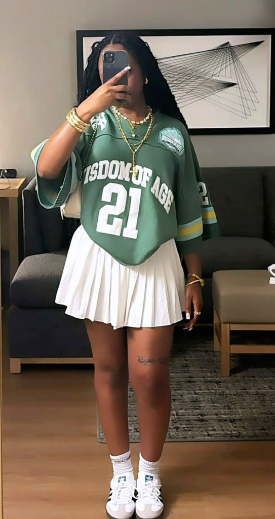 A football-style jersey with a white tennis skirt feels bold and energetic. I add gold chains, bangles, and classic sneakers for a retro vibe. This outfit is perfect when I want to stand out confidently.