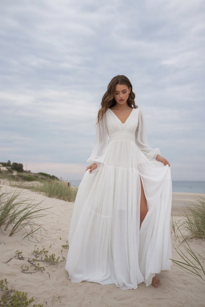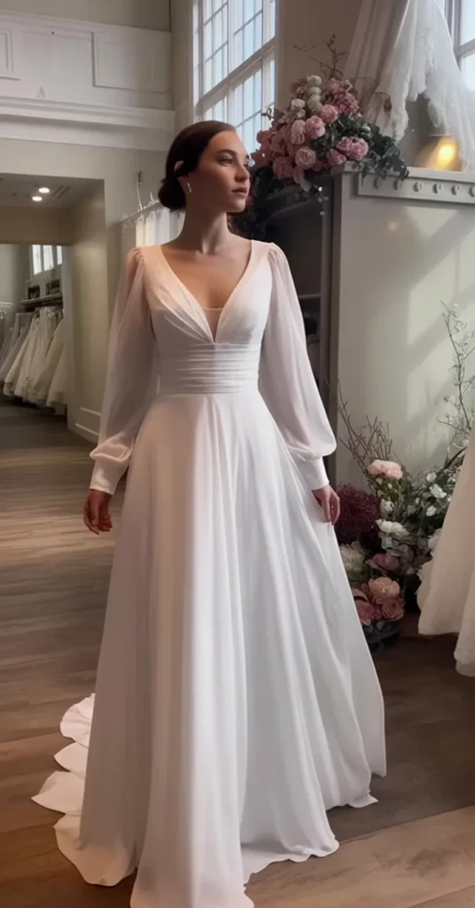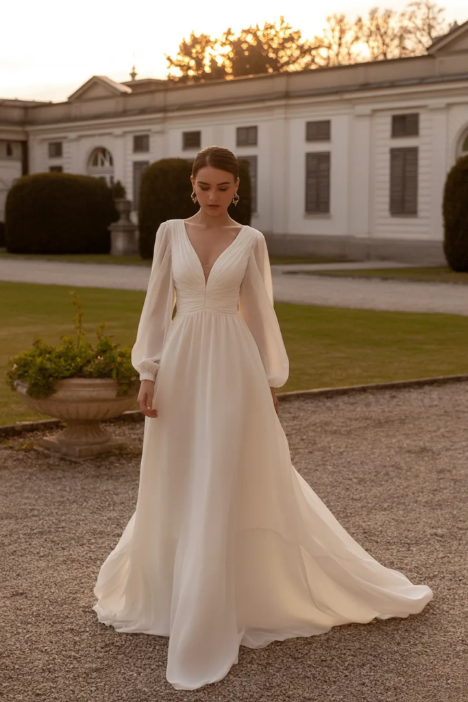 I really like how this dress balances simplicity with elegance. The deep V gives it a modern feel, while the bishop sleeves soften the overall look. From what I’ve seen, this style works especially well in outdoor weddings where movement matters.
