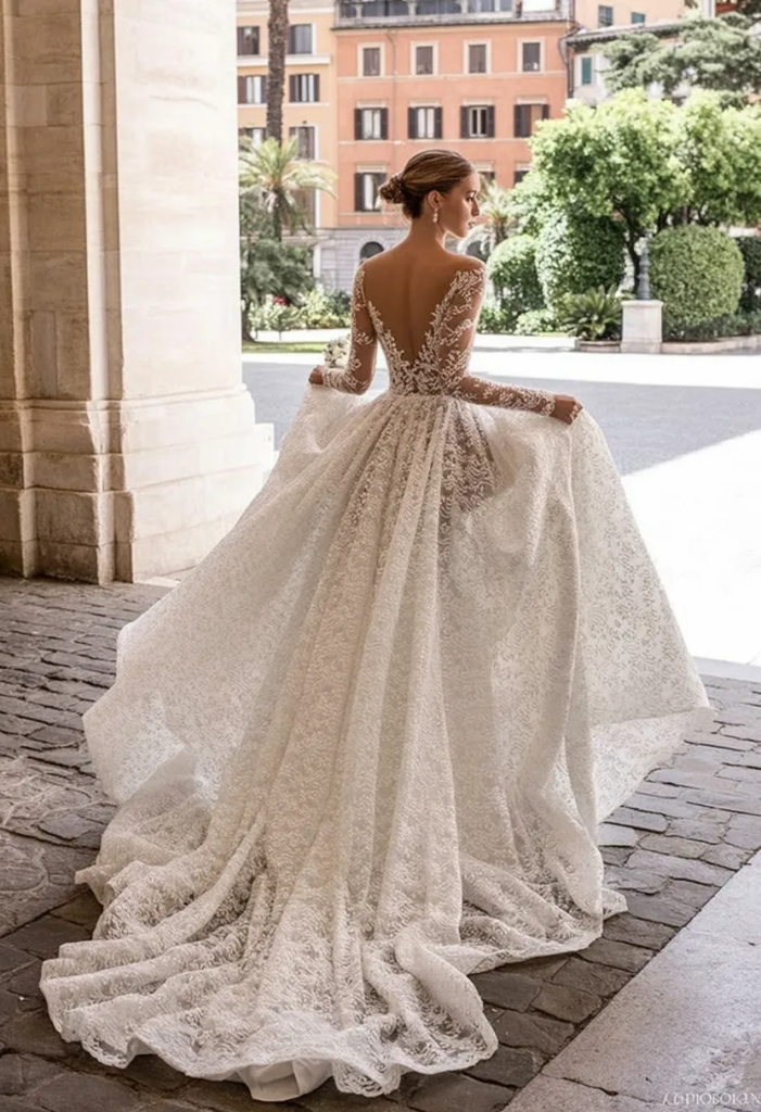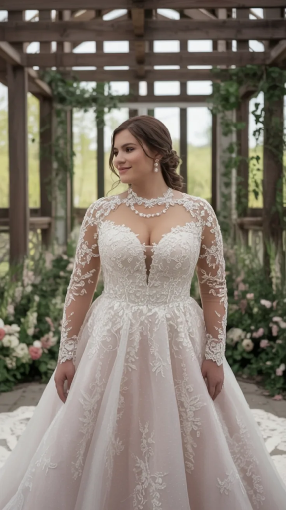 This is the kind of dress that truly stands out. The combination of lace, structure, and volume creates a strong bridal presence. In my opinion, illusion necklines are one of the best features for coverage without losing elegance.
