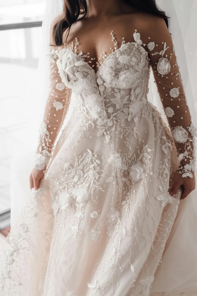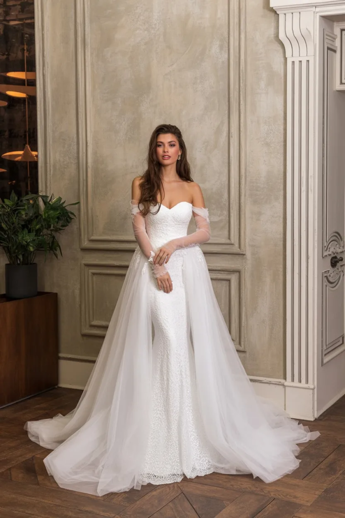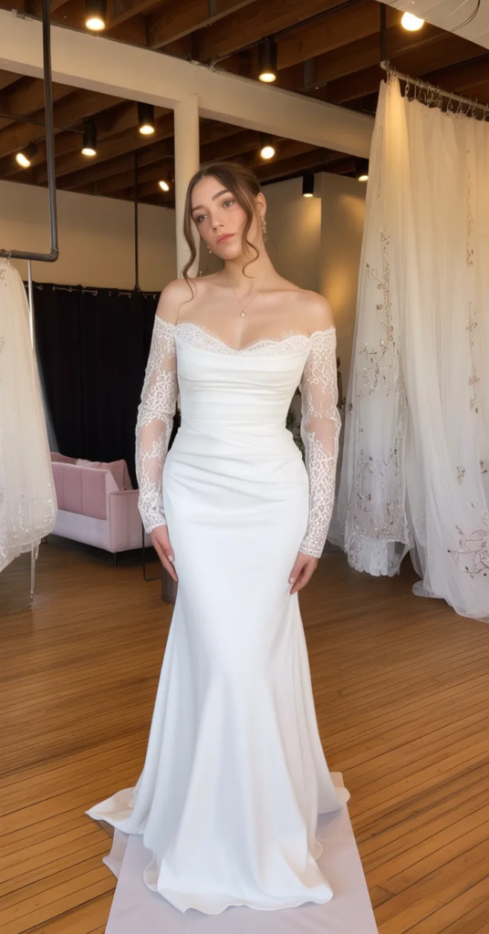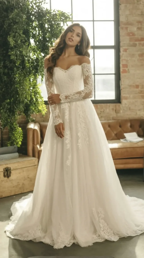I find this style perfect for brides who want a soft, romantic look without going over the top. The off-shoulder neckline adds a bit of charm, while sleeves keep it balanced.